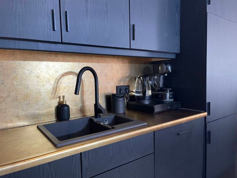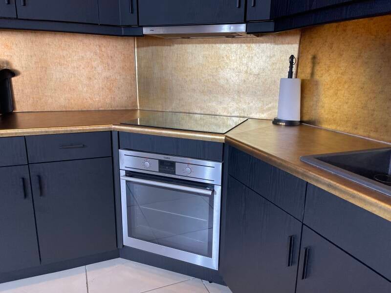 Daarnaast is ook het aanrechtblad en de achterwand voorzien van folie, Gold Crack.